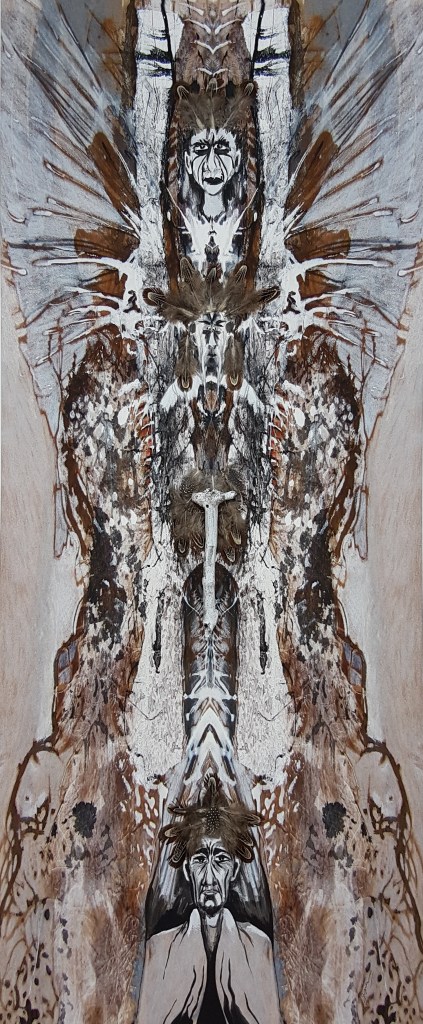 This work for The Blake Prize is a metaphor for my adaptability to life’s challenges. I deconstruct these issues through my poetry and by using nature’s detritus which drops to the earth or is washed up by the sea to become renewed. Ironically in order to find its potential, these objects must be discarded by nature before being rescued, hence the parallels to life itself. I respond to voices in the dark, dreams and nightmares, existentialism and the human condition. My poetry uses a different creative process, a separate, impulsive, abstract part of the psyche. My artworks are solid, but my poetry is liquid.