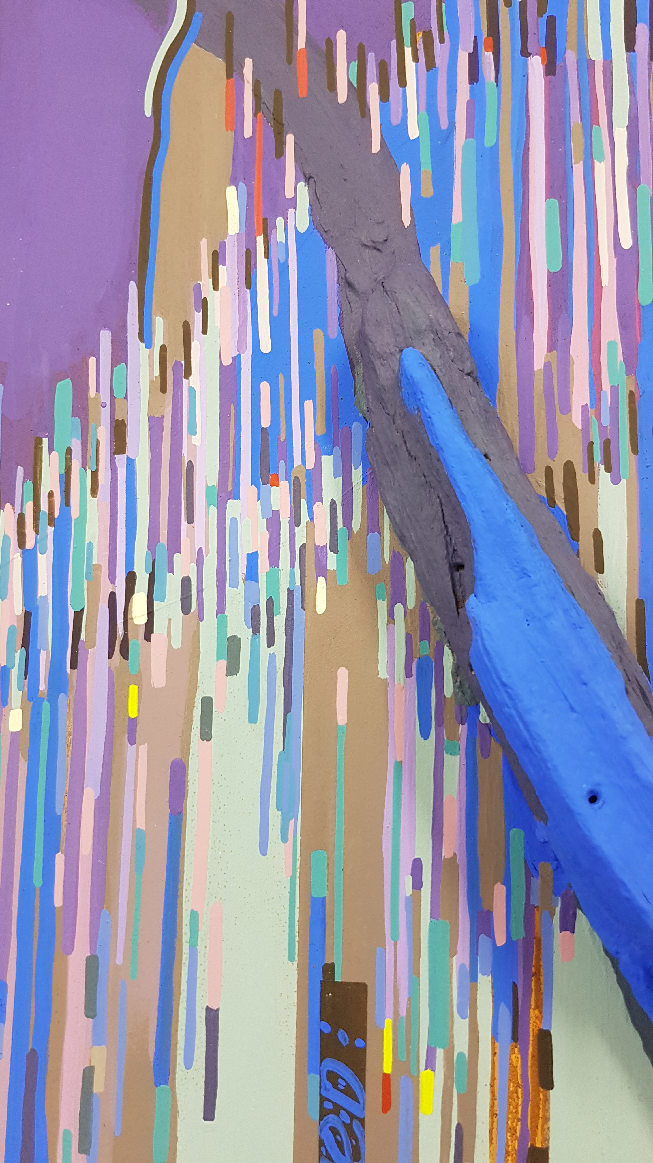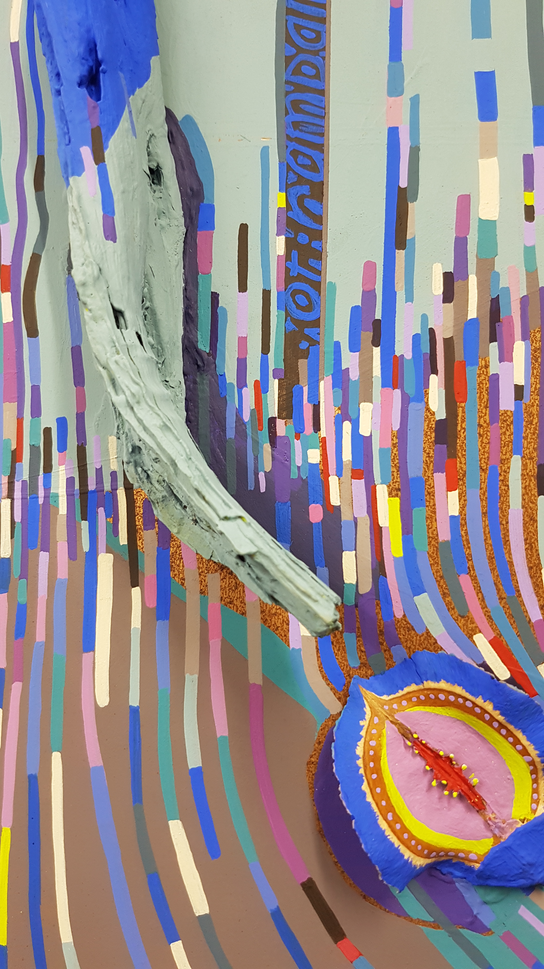 Gouache on core-ten steel, bush sticks and a jacaranda pod