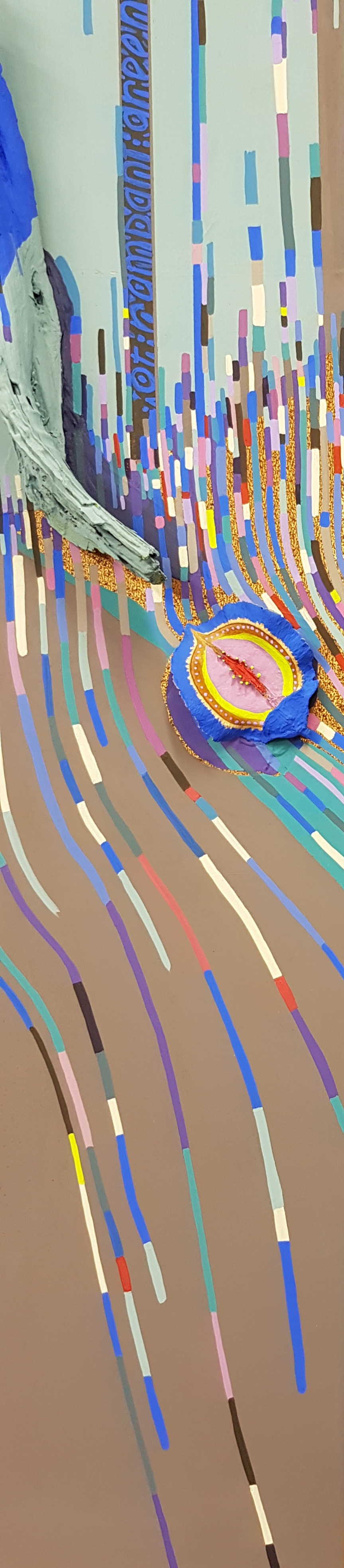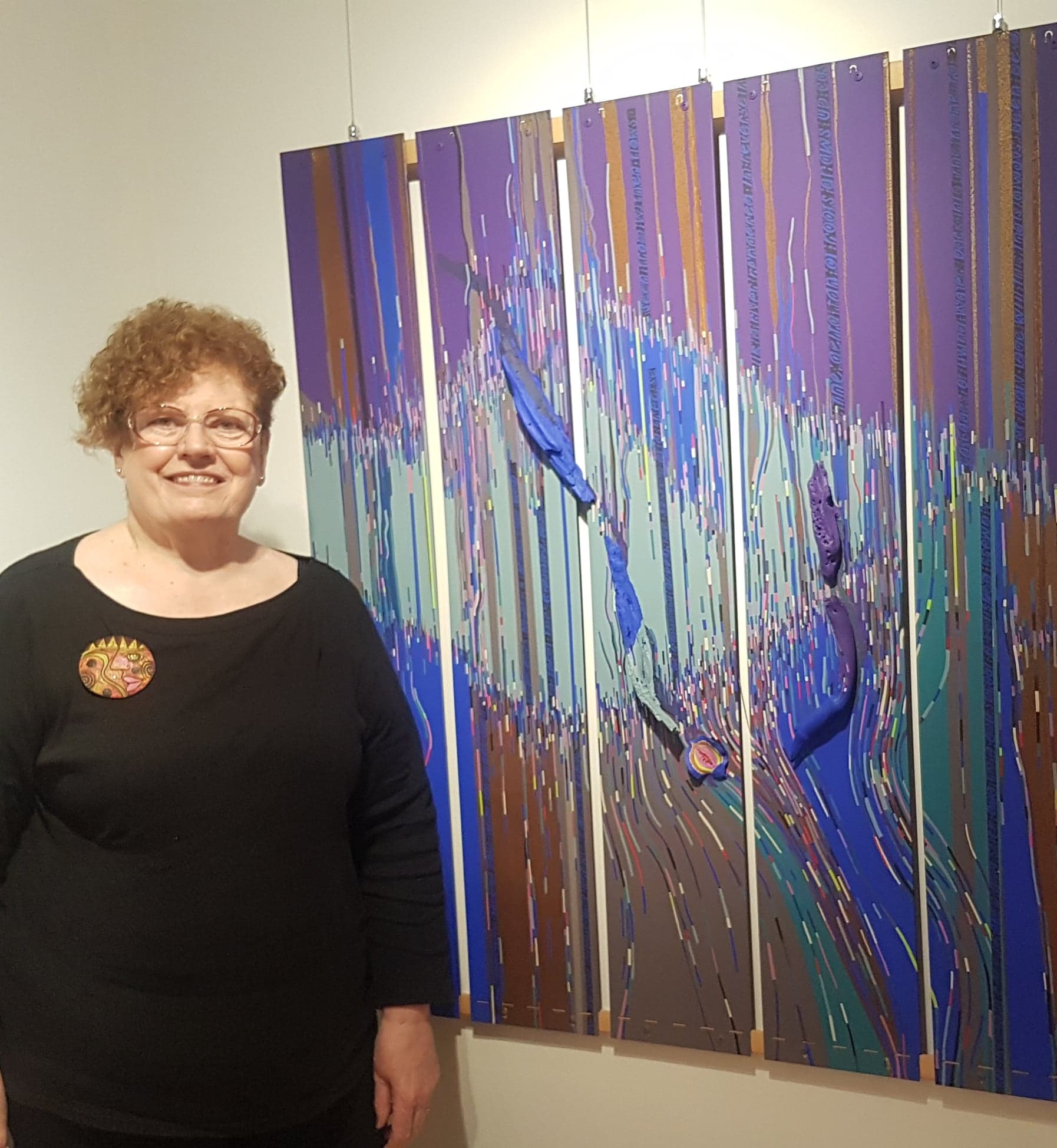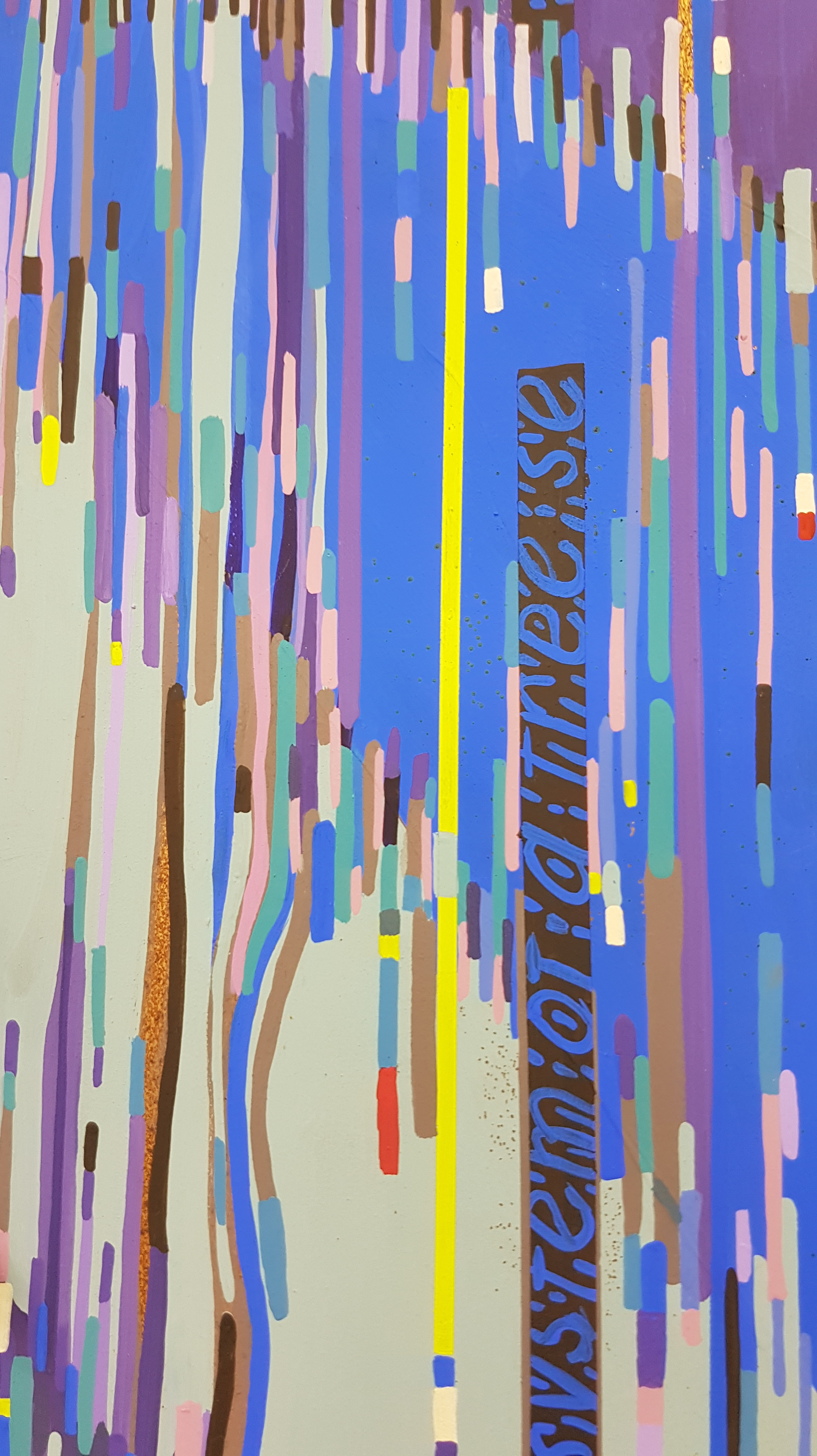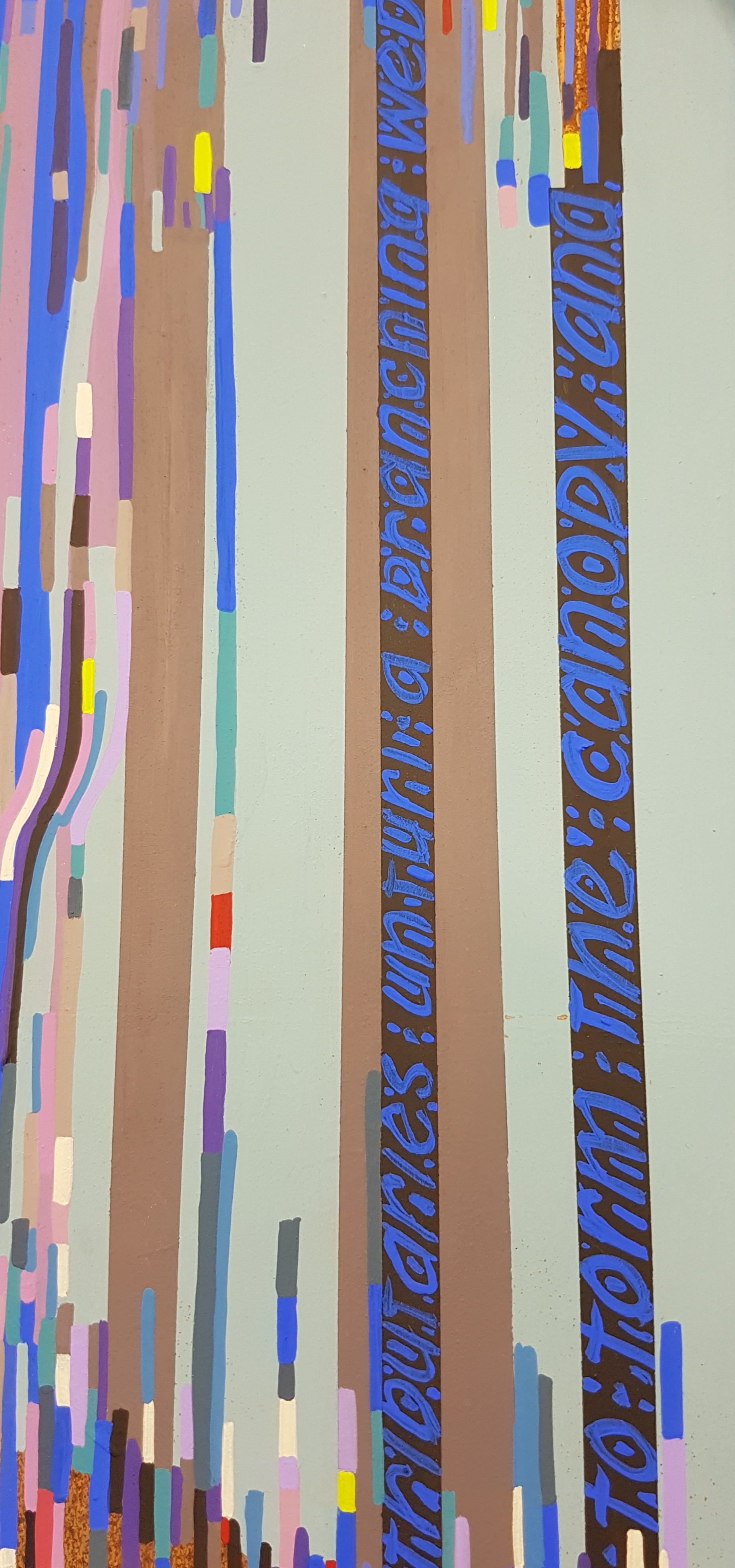 I wanted to explore a new ‘canvas’ for Dissonance, so, intrigued by core-ten steel, I decided to make a pentaptych, using the colours evoked by Carolyn Kelshaw’s poem ‘River Tree’ and hidden systems in the form of random and chaotic barcodes, with the entire poem as ribbons of patterned text.